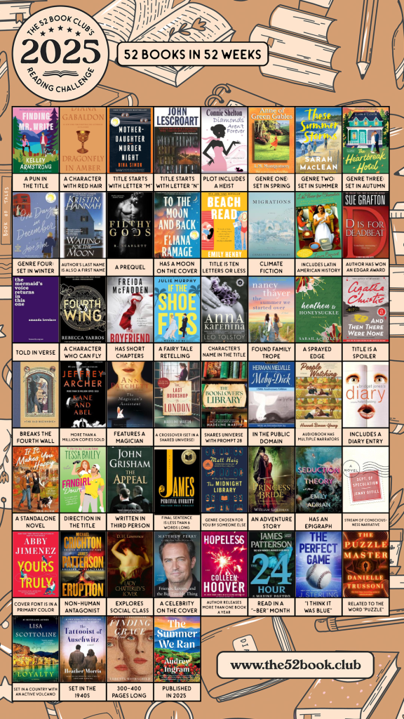 With this week’s completion of Loyalty, I have successfully completed the main 2025 reading challenge of The 52 Book Club! Let the celebration begin! I have long had a goal of reading 52 books in a single calendar year, but always fell short and didn’t think it was an obtainable goal for me. Actually, Loyalty is my 70th book of 2025. I don’t know that this will be the normal pace for me from now on, but I do know that I have really enjoyed reading for the prompts provided. Just because I think it is a thing of beauty that I want to see again, here is the completed graphic of my 2025 reading challenge.