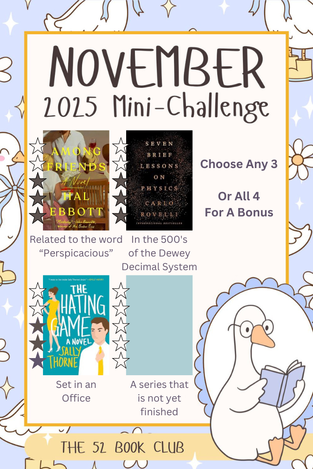And with that finish, I also completed the November 2025 mini-challenge of The 52 Book Club.