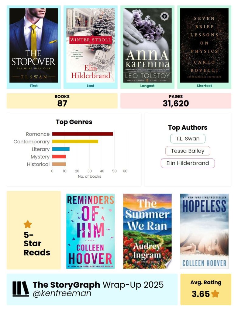 Let’s look at the numbers for 2025. I crushed my goal of 52 books for the year and finished the year with 87 books read! Just so there’s no question that I was only reading tiny works, I had a grand total of 31,620 pages read. With 9 books earning 5 stars, I had a year of really good reading. (In fact, I gave 43 of the year’s books 4 stars or higher.) I tended to finish the books I started too….only 4 DNFs for 2025.