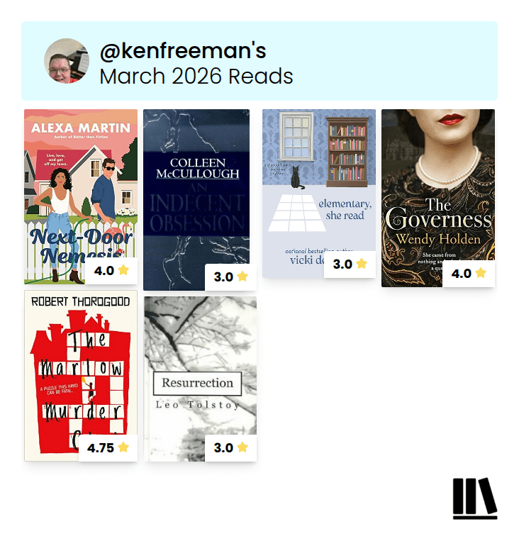 - Highest rated book: The Marlow Murder Club by Robert Thorogood – 4.75 stars